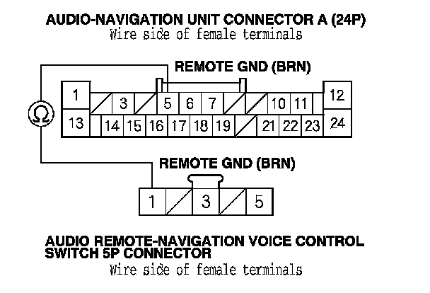 9. Check for continuity between audio-navigation unit connector A (24P) terminal No. 5 and the audio remote-navigation voice control switch 5P connector terminal No. 1.