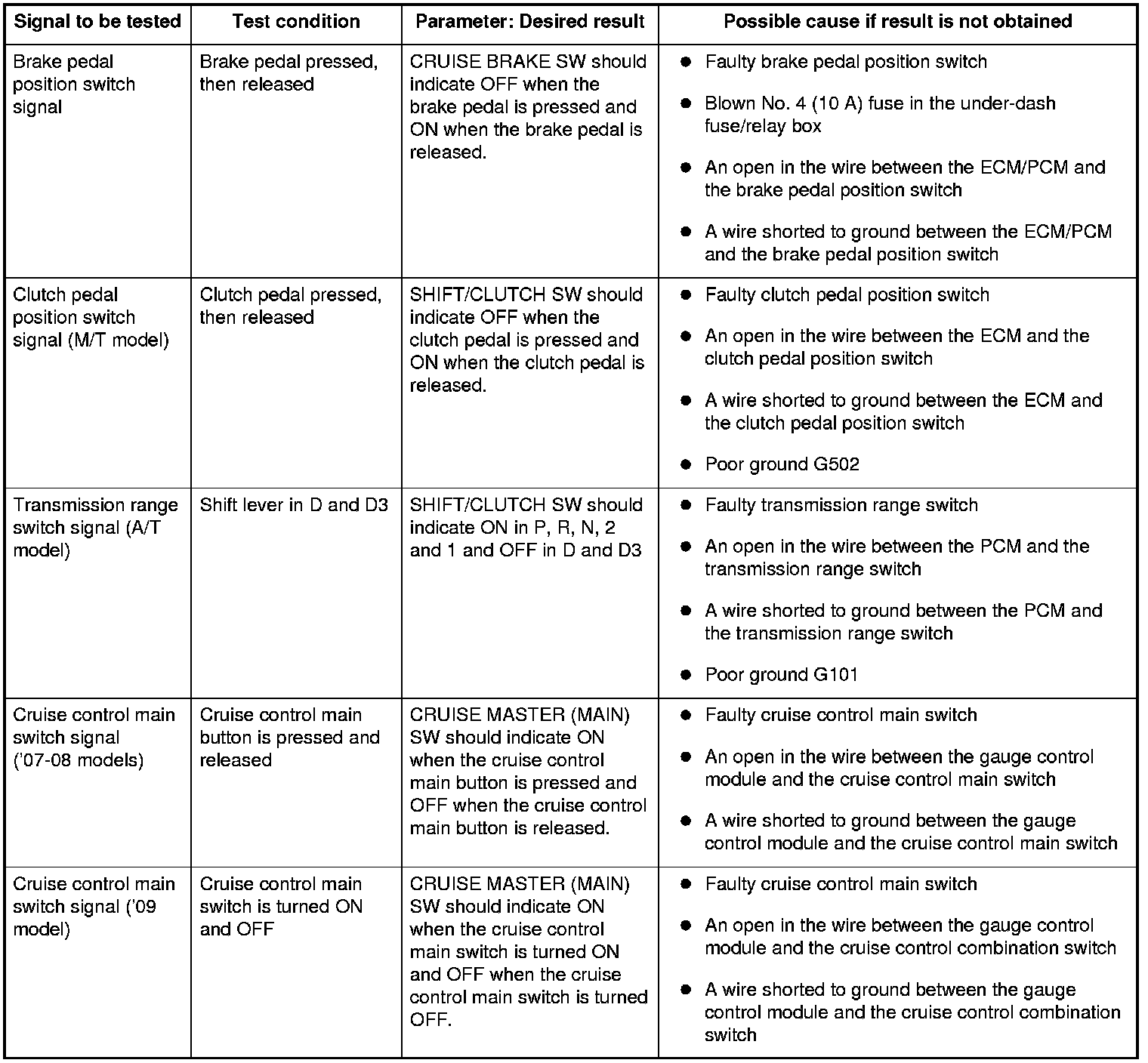 NOTE: Intermittent failures are often caused by loose circuit connections. While monitoring cruise control inputs, flex the circuit wires, and note if any of the test results change.