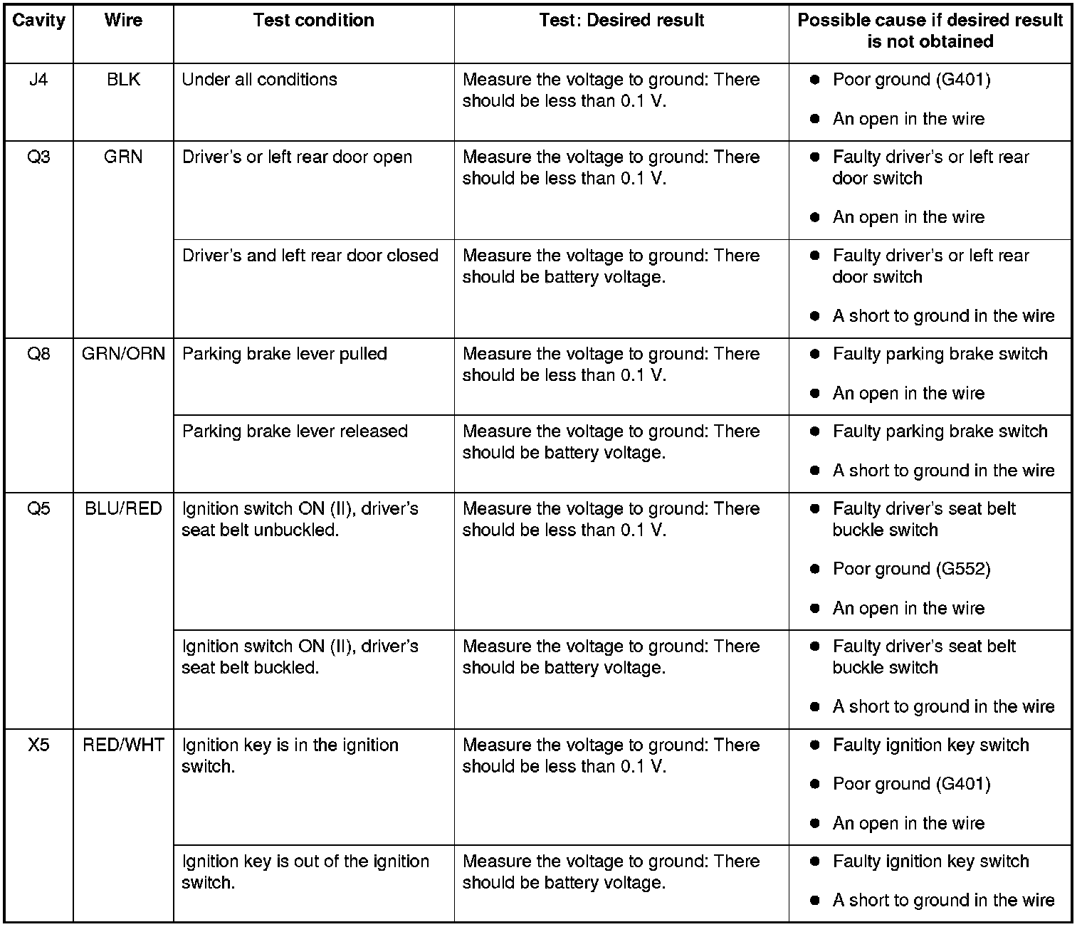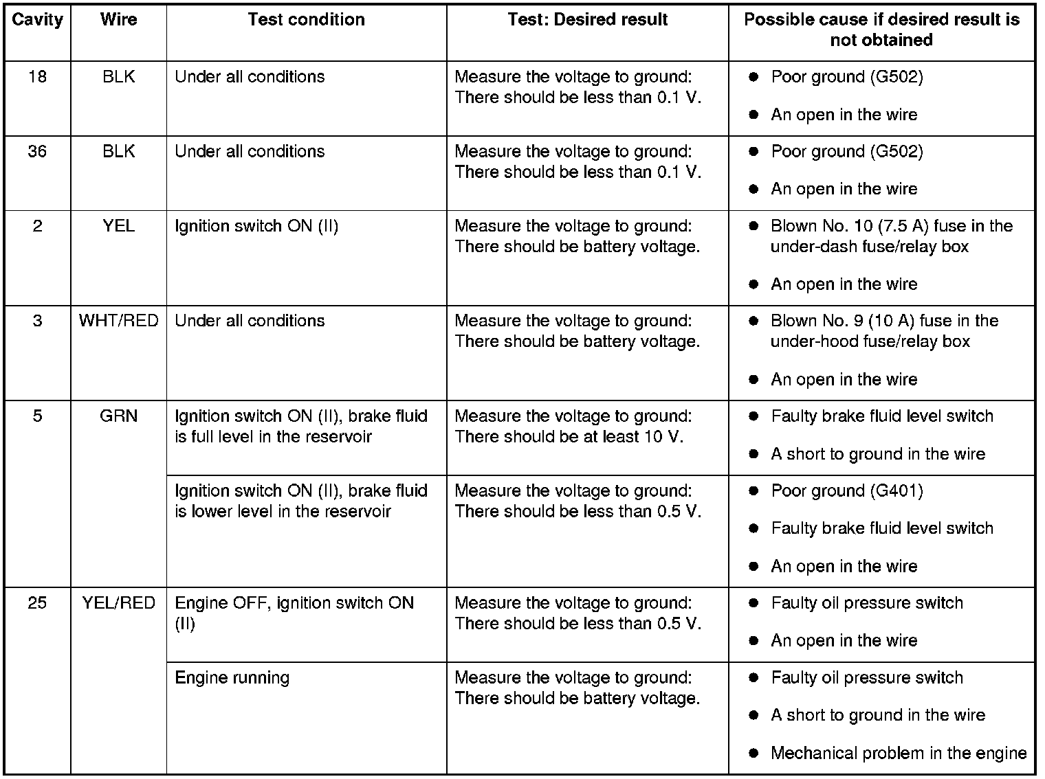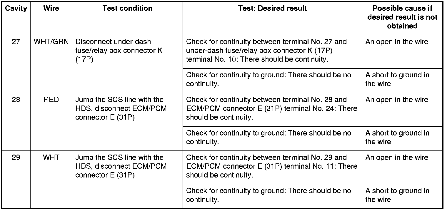 11. Reconnect the connectors to the under-dash fuse/relay box, and do these input tests at the following connectors.