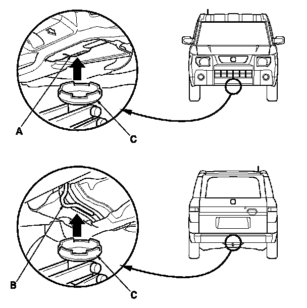 3. Position the floor jack under the front jacking bracket (A) or the rear jacking bracket (B). Center the jacking bracket on the jack lift platform (C), and jack up the vehicle high enough to fit the safety stands under it.