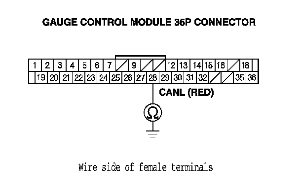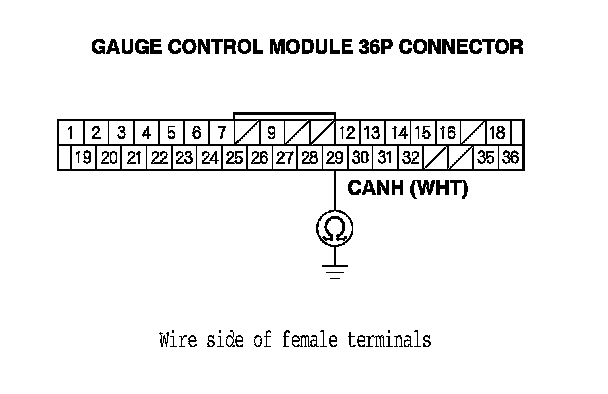 14. Check for continuity between gauge control module 36P connector terminal No. 28 and body ground.
