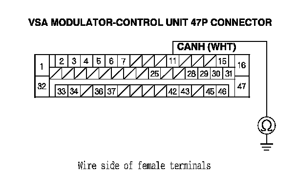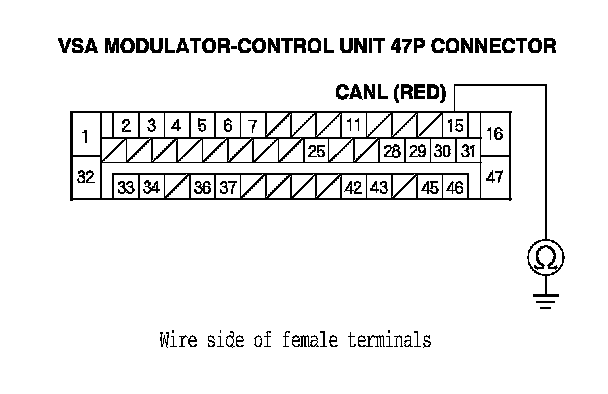 15. Check for continuity between VSA modulator-control unit 47P connector terminal No. 15 and body ground.