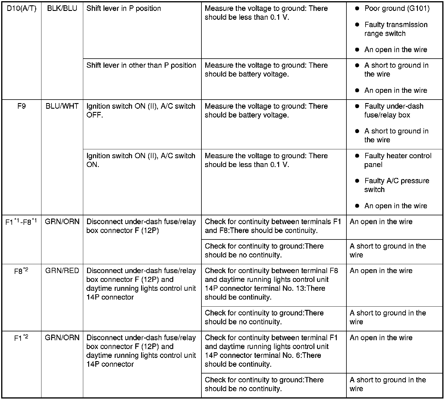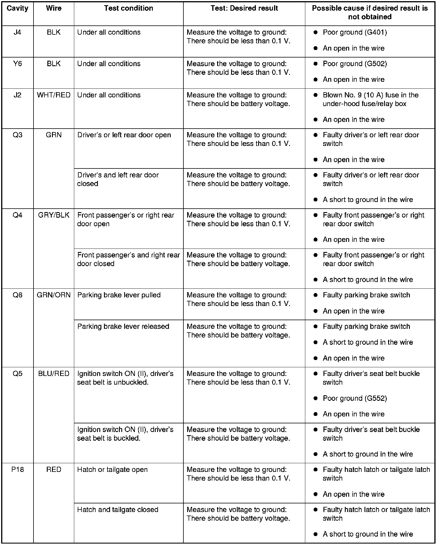 4. Reconnect the connectors to the under-dash fuse/relay box, and do these input tests at the following connectors on the under-dash fuse/relay box.