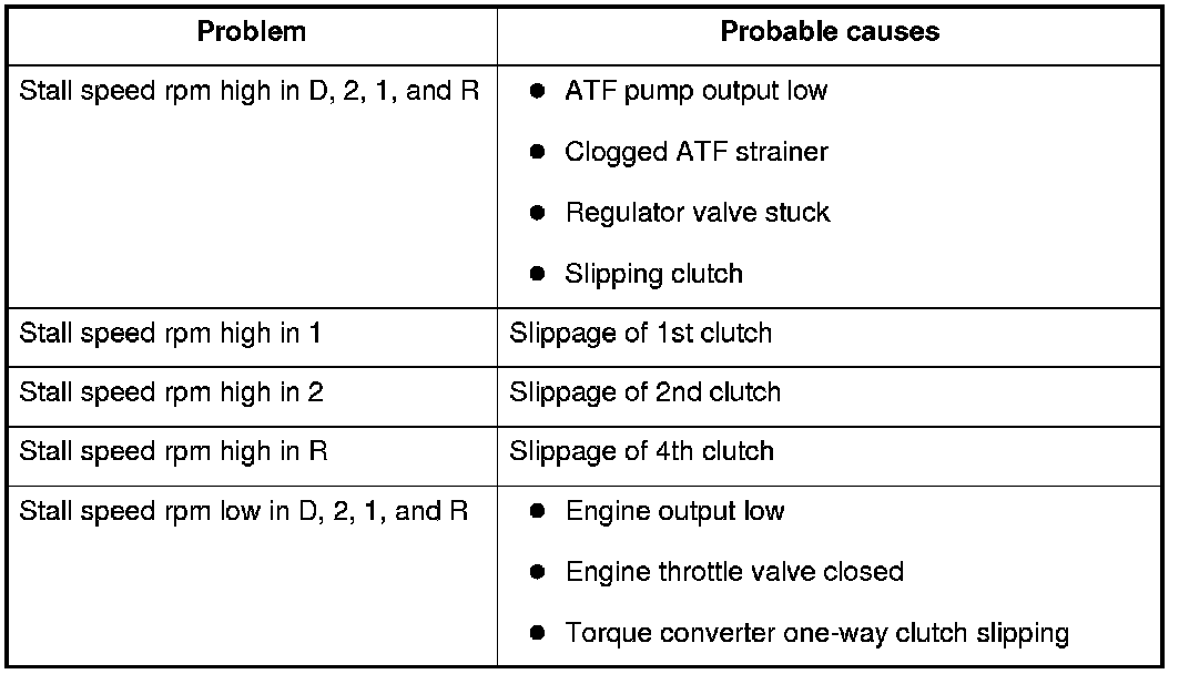 9. If the stall speeds are out of the service limit, problems and probable causes are listed in the table.