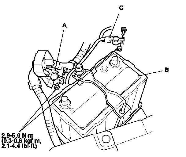3. Reconnect the positive cable (A) to the battery (B) first, then reconnect the negative cable (C) to the battery.