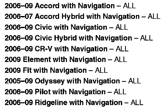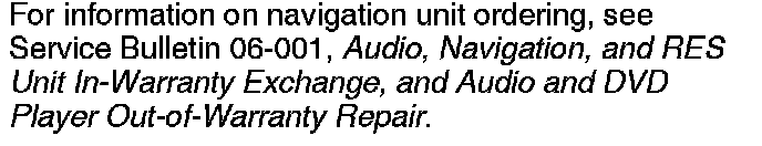 For information on navigation unit ordering, see Service Bulletin 06-001, Audio, Navigation, and RES Unit In-Warranty Exchange, and Audio and DVD Player Out-of-Warranty Repair.