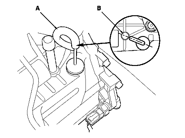 9. Insert the ATF dipstick (A) into the transmission with the handle pointing toward the breather pipe (B).
