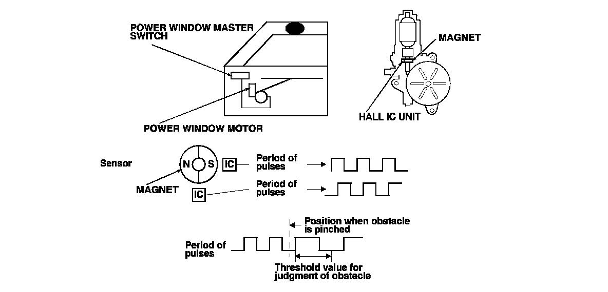 The driver's power window motor incorporates a Hall IC unit (pulser) which generates pulses during the motor's operation and sends the pulses to the driver's power window control unit. As soon as the power window control unit detects a change in the pulse frequency from the Hall IC unit, the driver's power window control unit makes the power window motor stop and reverse. If the window is more than halfway closed, it will reverse to half open position. If the window is less than halfway closed, it will stop and reverse about 2 inches. This prevents pinching your hand or fingers during auto-up operation. The auto reverse operation is not active when the switch is held in the up position.