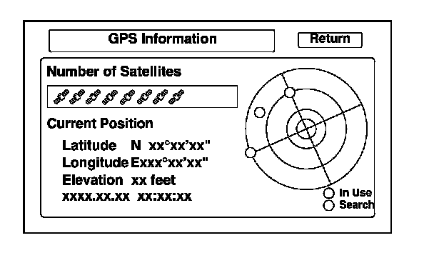 By pressing and holding the MENU button for 2 seconds, a GPS Detail screen appears. This screen displays real time incoming satellite positional data when the vehicle is outside in the open. The information shown on this screen is for factory use.