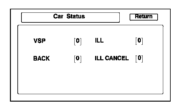 Use this screen to confirm that the audio-navigation unit is properly receiving input signals. Signals equal to (0) are OFF, and signals equal to (1) are ON. If the value on the display does not match the actual vehicle status, then check the wire carrying the signal.