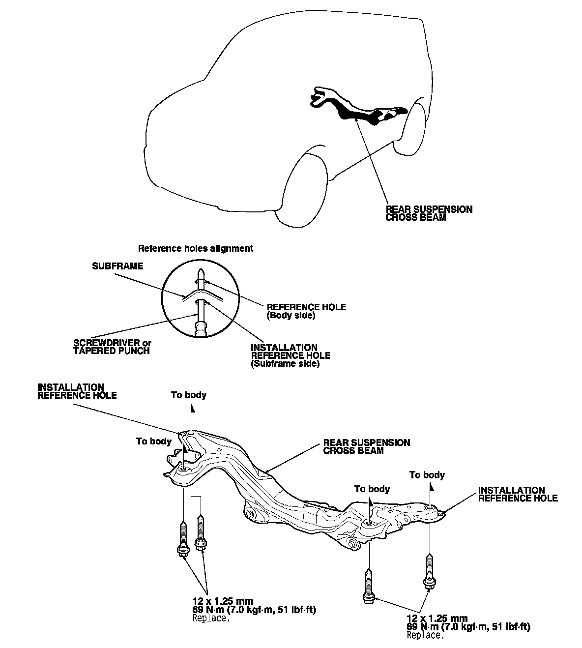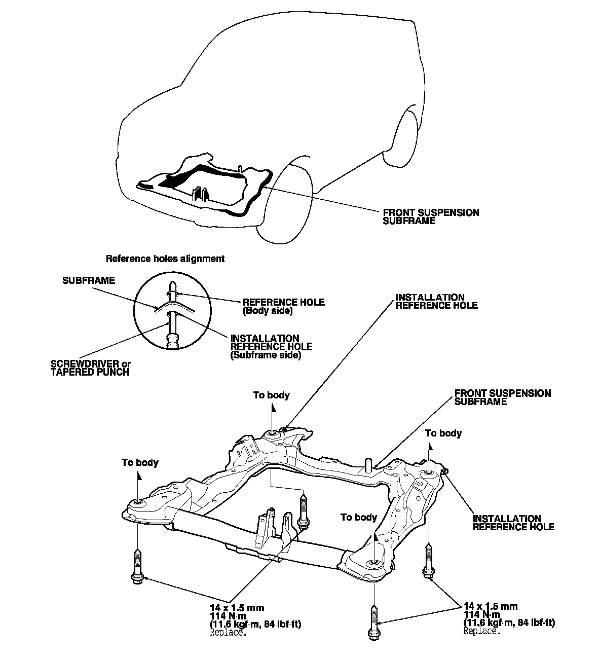 - When installing, align both installation reference holes in the subframe with the reference holes in the body using a screwdriver or tapered punch as a guide.