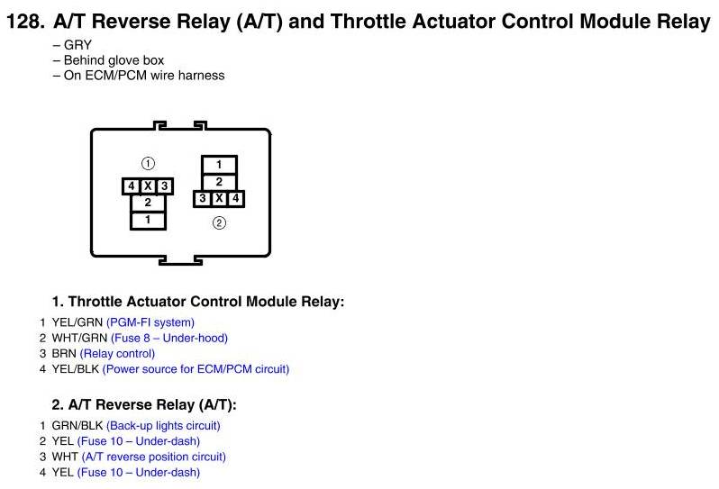 View 128 - A/T Reverse Relay (A/T) And Throttle Actuator Control Module Relay Connector View