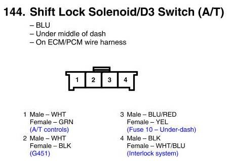 View 144 - Shift Lock Solenoid/D3 Switch Connector View (A/T)