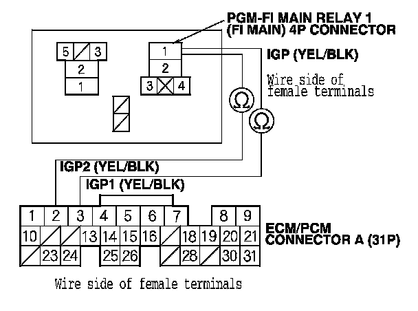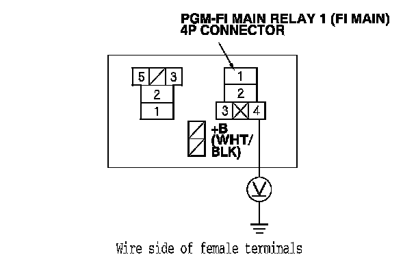 44. Check for continuity between PGM-FI main relay 1 (FI MAIN) 4P connector terminal No. 1 and body ground.