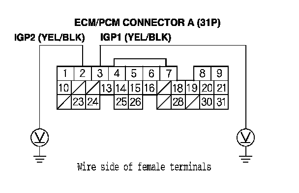 68. Measure the voltage between body ground and ECM/PCM connector terminals A2 and A3 individually.
