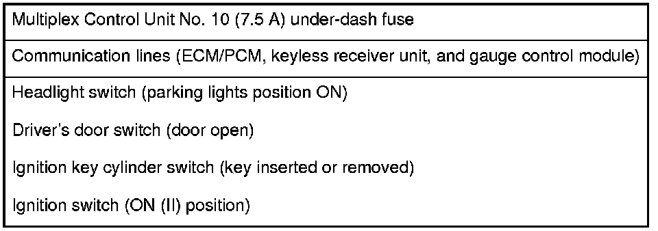 When the ignition switch is turned to ON (II), the multiplex control unit, gauge control module, and ECM/PCM wake up at the same time without "talking" to each other through the communication lines. When any switch in the multiplex system is turned on, it wakes up its related control unit which, in turn, wakes up the other units.