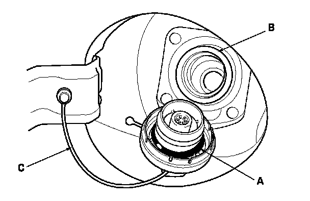 2. Check the fuel fill cap seal (A) and the fuel fill pipe mating surface (B). Verify that the fuel fill cap tether cord (C) is not caught under the cap.