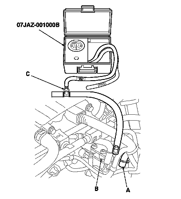 8. Disconnect the vacuum hose (A) from the EVAP canister purge valve (B) in the engine compartment, then connect a T-fitting (C) to the vacuum gauge, and connect the vacuum pump/gauge 0-30 in.Hg, to the EVAP canister purge valve as shown.