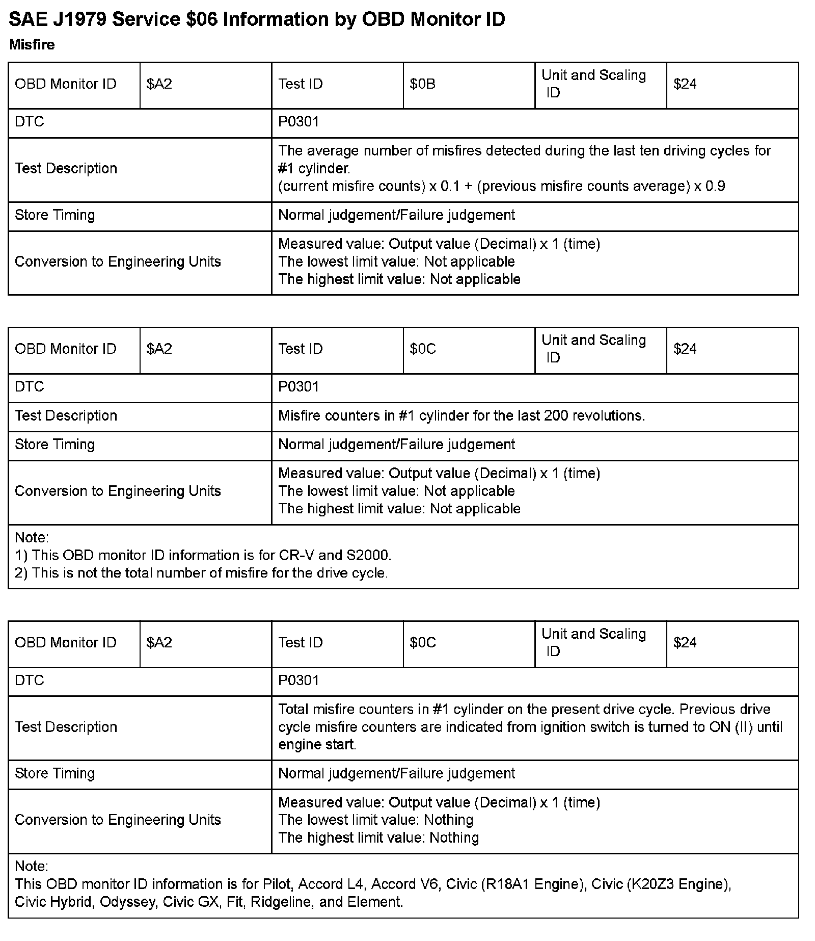 SAE J1979 Mode/Service $06 Test Information: All 2009 Hondas