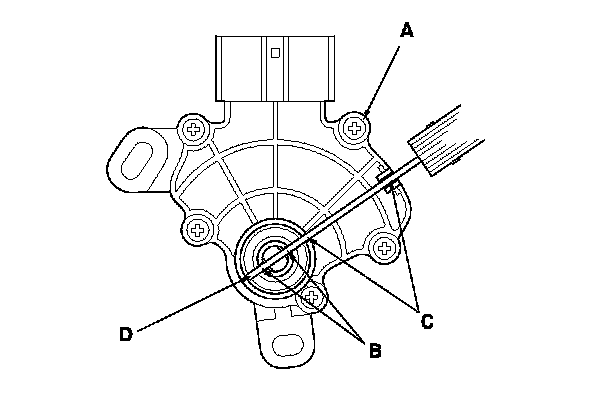 7. Set a new transmission range switch (A) to N. Align the cutouts (B) on the rotary-frame with the neutral positioning cutouts (C) on the transmission range switch. Then put a 2.0 mm (0.08 in.) feeler gauge blade (D) in the cutouts to hold the transmission range switch in N.