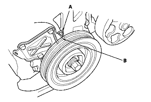 9. Aim the light toward the pointer (A) on the cam chain case. Check the ignition timing under a no load condition (headlights, blower fan, rear window defogger, and air conditioner are turned off).