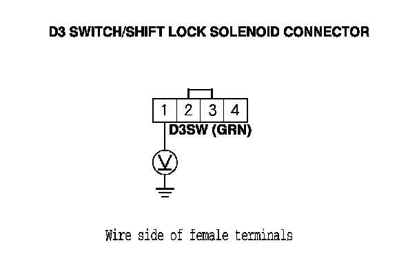 10. Measure the voltage between D3 switch/shift lock solenoid connector terminal No. 1 and body ground.