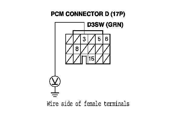 11. Measure the voltage between PCM connector terminal D3 and body ground.
