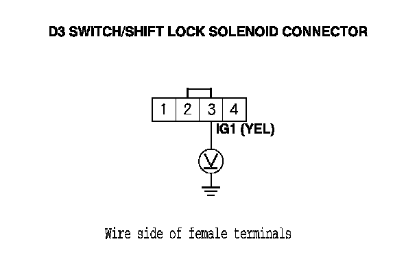7. Measure the voltage between D3 switch/shift lock solenoid connector terminal No. 3 and body ground.