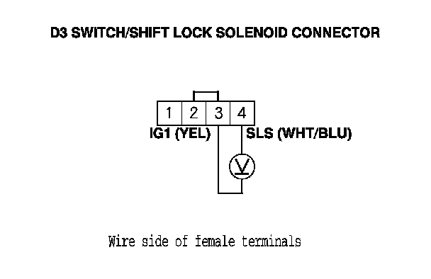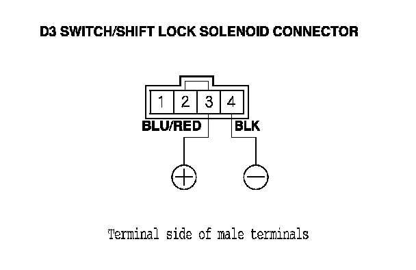 NOTE: Do not connect the battery positive terminal to terminal No. 4 or you will damage the diode inside the shift lock solenoid.