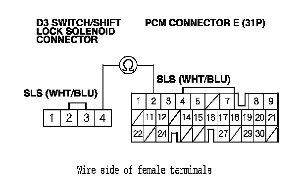 12. Check for continuity between PCM connector terminal E2 and D3 switch/shift lock solenoid connector terminal No. 4.