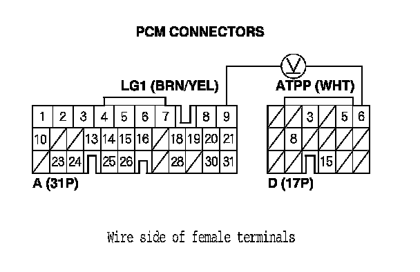 20. Measure the voltage between PCM connector terminals D6 and A9.