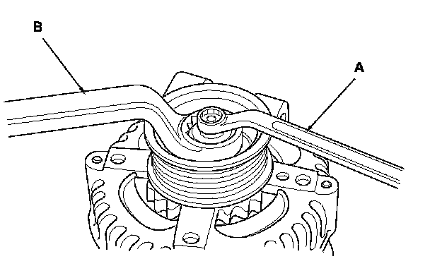 3. If the front bearing needs replacing, remove the pulley locknut with a 10 mm wrench (A) and a 22 mm wrench (B). If necessary, use an impact wrench.