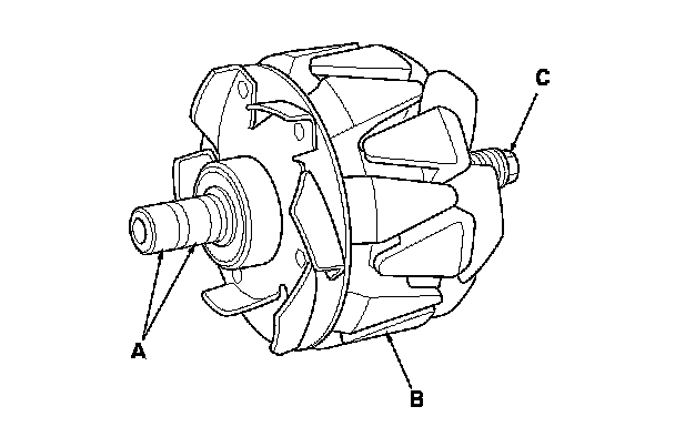 15. Check for continuity between each slip ring and the rotor (B) and the rotor shaft (C).