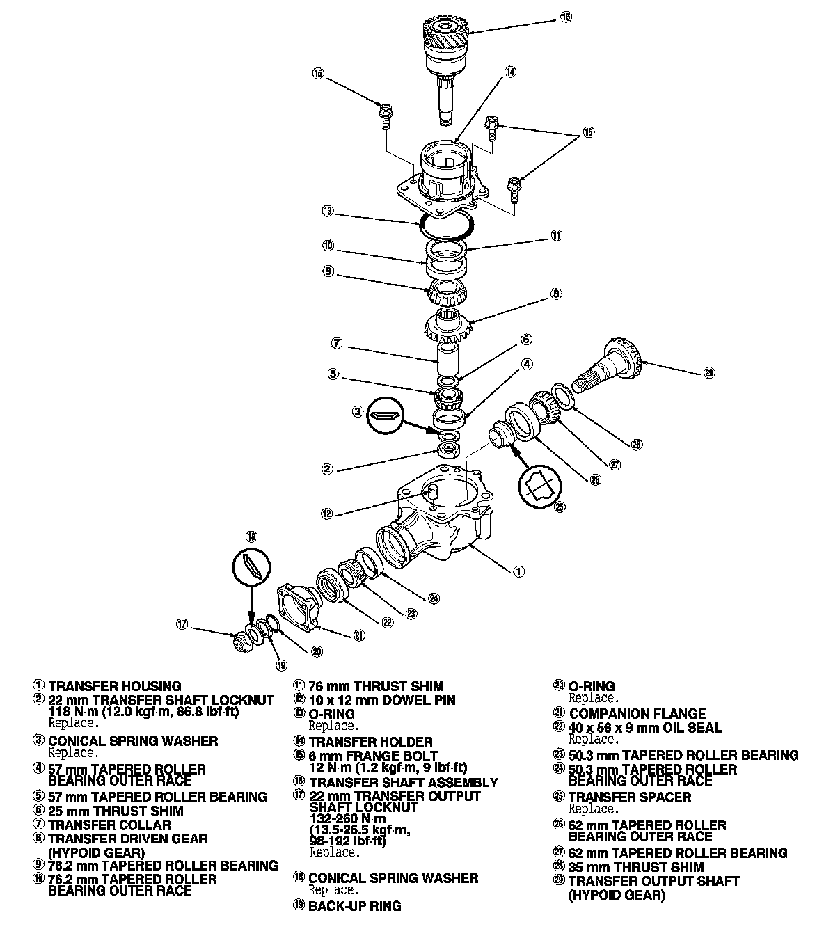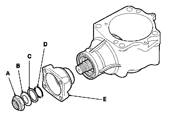 6. Remove the transfer output shaft locknut (A), the conical spring washer (B), the back-up ring (C), the O-ring (D), and the companion flange (E).