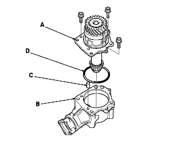 1. Remove the transfer holder assembly (A) from the transfer housing (B), then remove the dowel pin (C) and O-ring (D).
