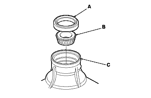 8. Remove the oil seal (A) and the 50.3 mm tapered roller bearing (B) from the transfer housing (C).