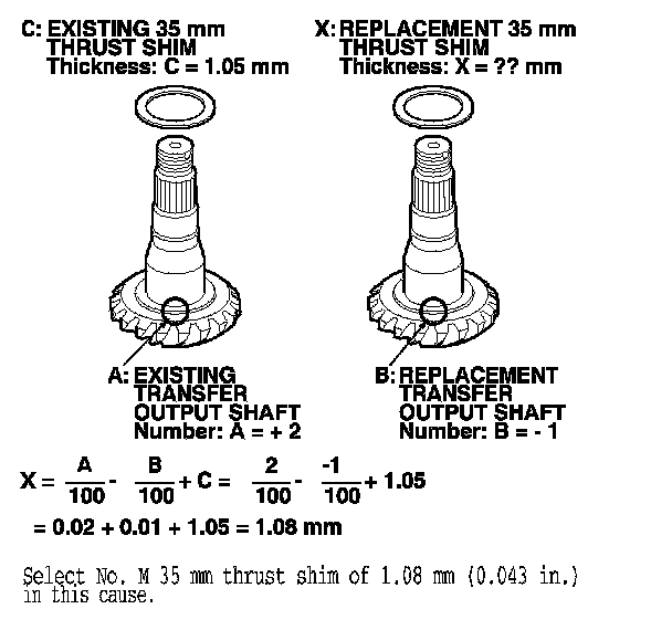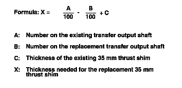1. Select the 35 mm thrust shim if the transfer output shaft is replaced. Calculate the thickness of the 35 mm thrust shim using the formula, and select the replacement 35 mm thrust shim from the table.