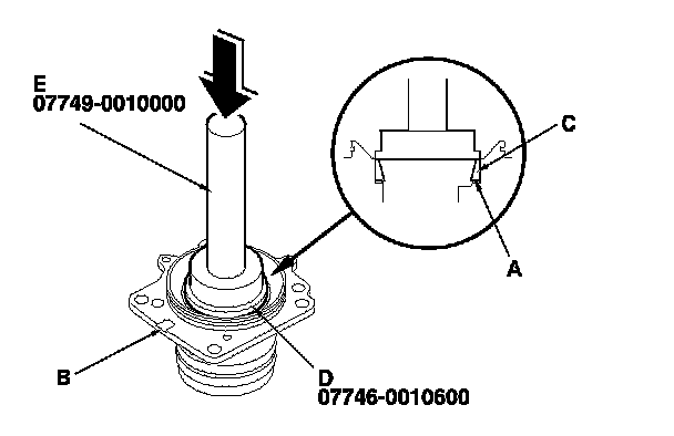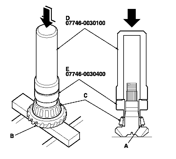 40. Install the 76.2 mm tapered roller bearing outer race (C) using the 72 x 75 mm bearing driver attachment (D), the 15 x 135L driver handle (E), and a press in the direction shown.