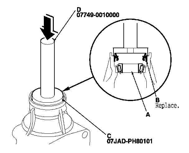 - Replace the tapered roller bearing and the tapered roller bearing outer race as a set if either part is replaced.