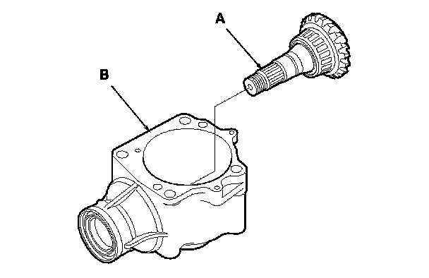 6. Install the transfer output shaft (A) in the transfer housing (B).