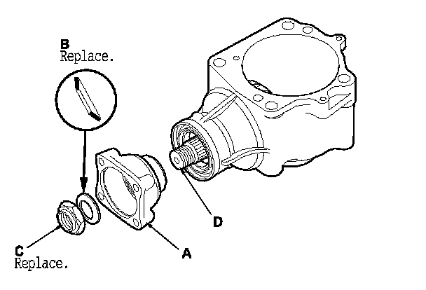 7. Install the companion flange (A), a new conical spring washer (B), and a new locknut (C) on the transfer output shaft (D).