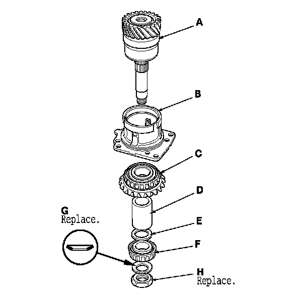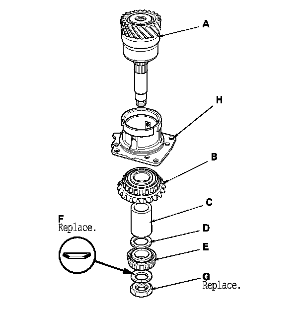 10. Install the transfer shaft assembly (A) in the transfer holder (B), then install the transfer drive gear (C), the transfer collar (D), the 25 mm thrust shim (E), the 57 mm tapered roller bearing (F), a new conical spring washer (G), and a new transfer shaft locknut (H) on the transfer shaft assembly.