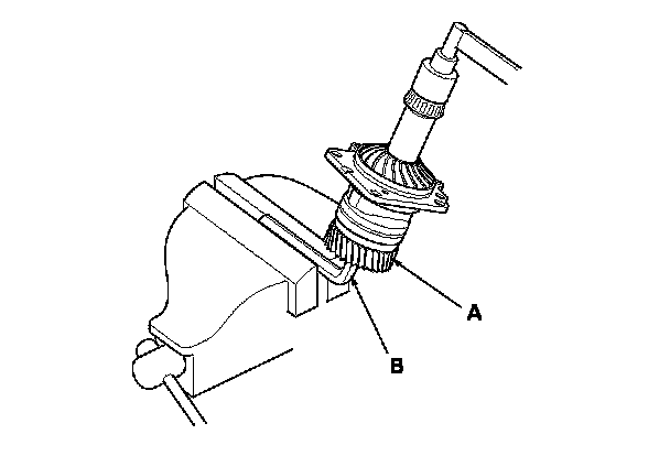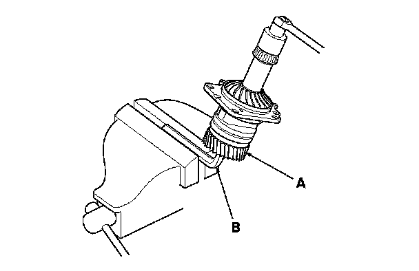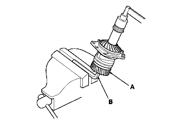 31. Securely clamp the transfer housing (A) in a bench vise (B) with wood blocks. Then rotate the companion flange several times to seat the tapered roller bearings.