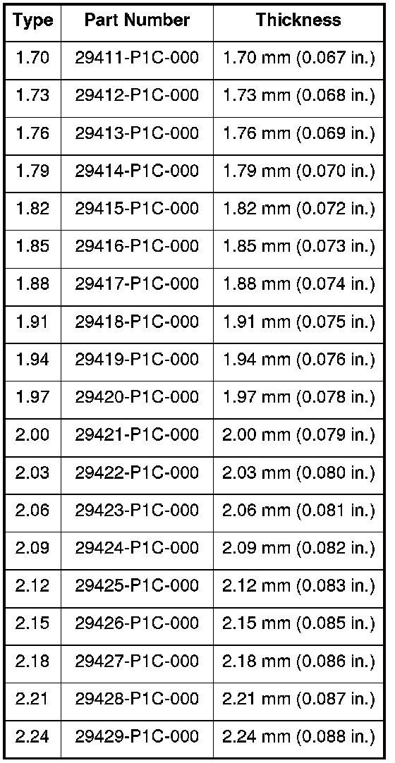 2. Select the 35 mm thrust shim if the tapered roller bearing on the transfer output shaft is replaced. Measure the thickness of the replacement bearing and the existing bearing, and calculate the difference of the bearing thickness. Adjust the thickness of the existing 35 mm thrust shim by the amount of the difference in bearing thickness, and select the replacement 35 mm thrust shim from the table.