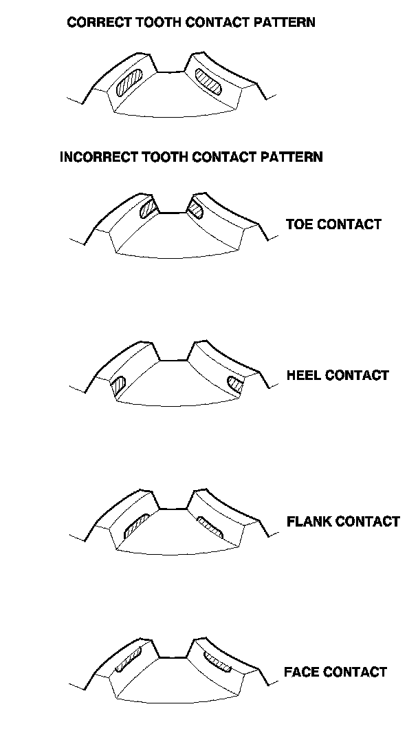 Use a thicker 25 mm thrust shim to move the transfer drive gear away from the transfer output shaft. Flank contact must be adjusted within the limits of the transfer gear backlash. If the backlash exceeds the limits, adjust as described under Heel Contact.