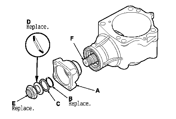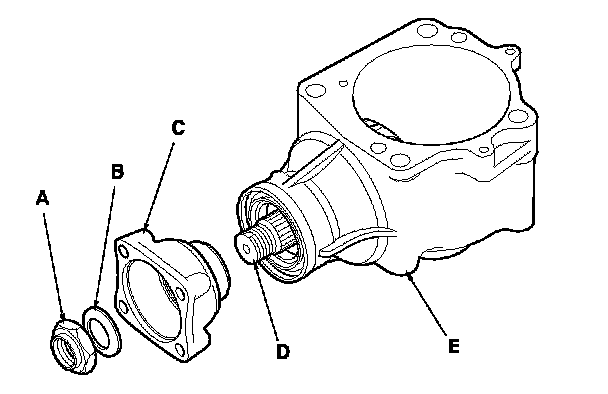 25. Install the companion flange (A), a new O-ring (B), the back-up ring (C), the conical spring washer (D), and the locknut (E) on the transfer output shaft (F).
