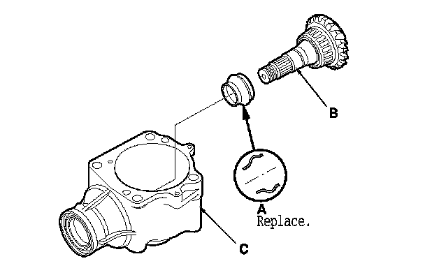 24. Install a new transfer spacer (A) on the transfer output shaft (B) in the direction shown, then install them in the transfer housing (C).