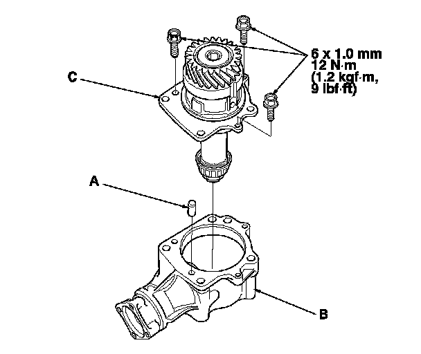 13. Install the dowel pin (A) and the transfer holder assembly (B) in the transfer housing (C).