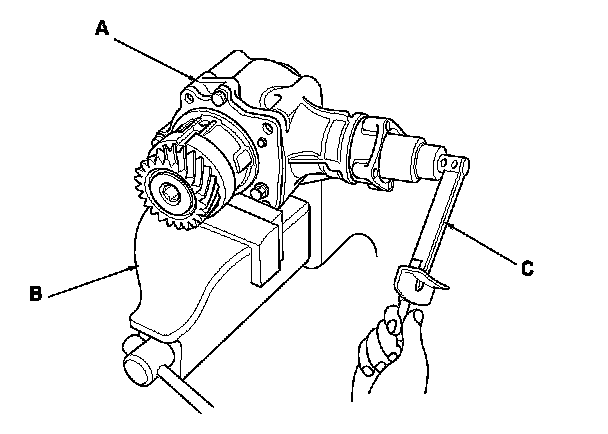 8. Securely clamp the transfer housing (A) in a bench vise (B) with wood blocks. Then install the holder handle (C) and the companion flange holder (D) on the companion flange.