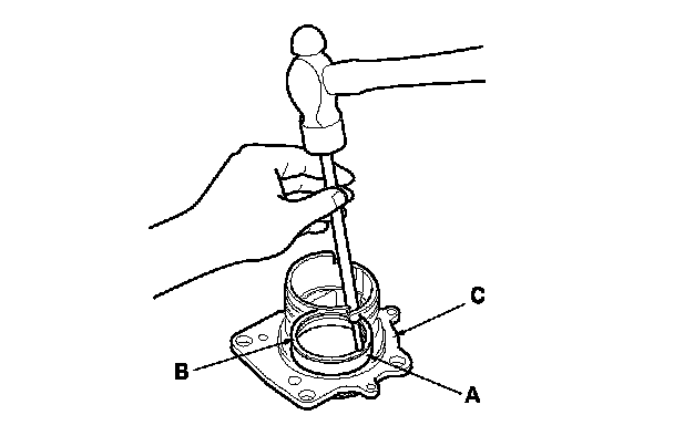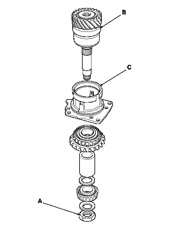 37. Remove the 76.2 mm tapered roller bearing outer race (A) and the 76 mm thrust shim (B) from the transfer holder (C).